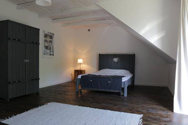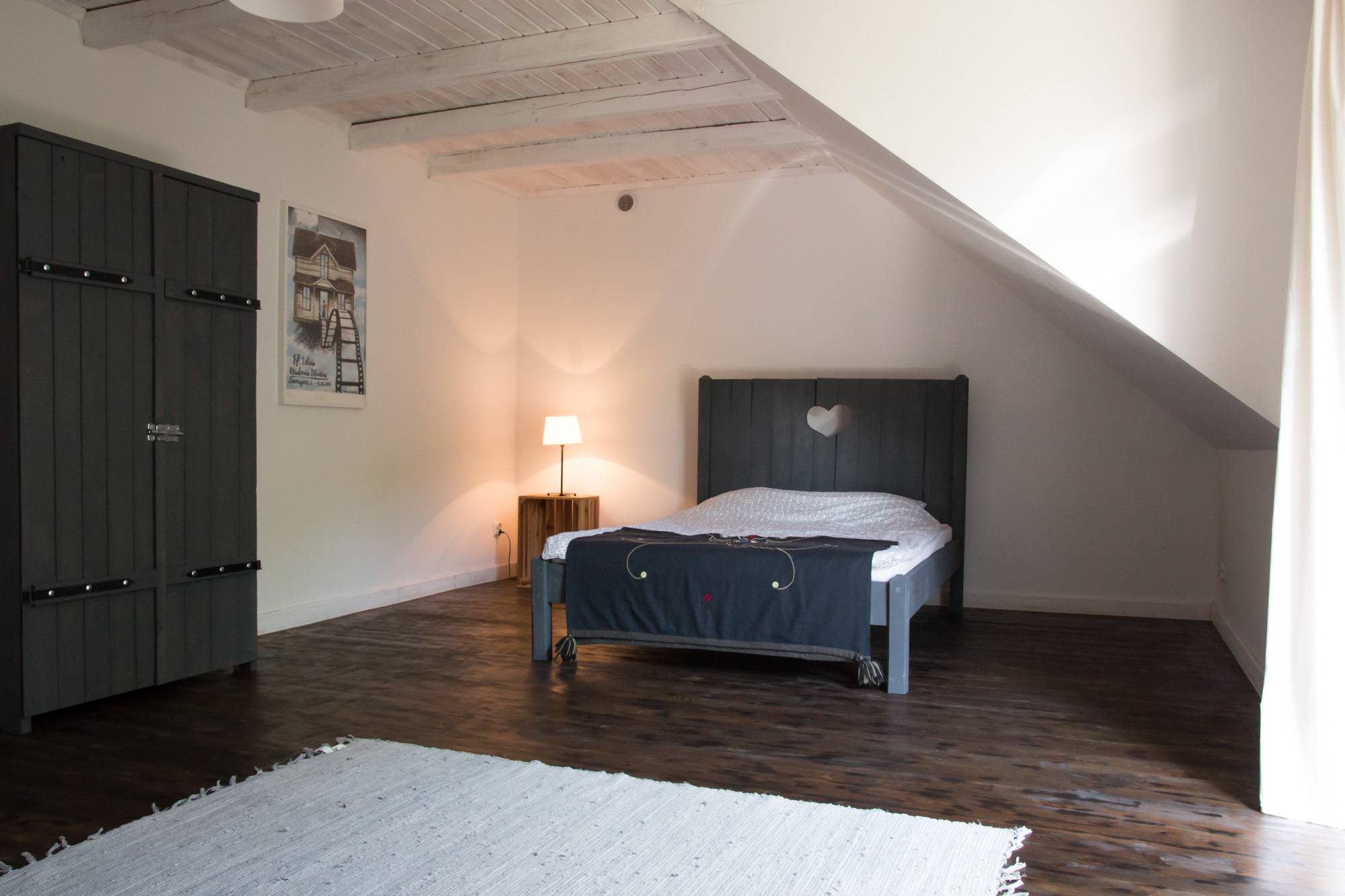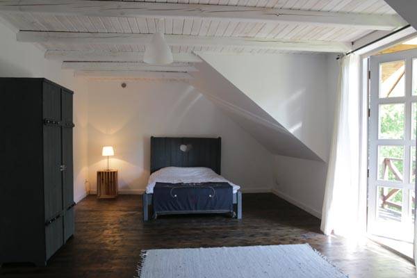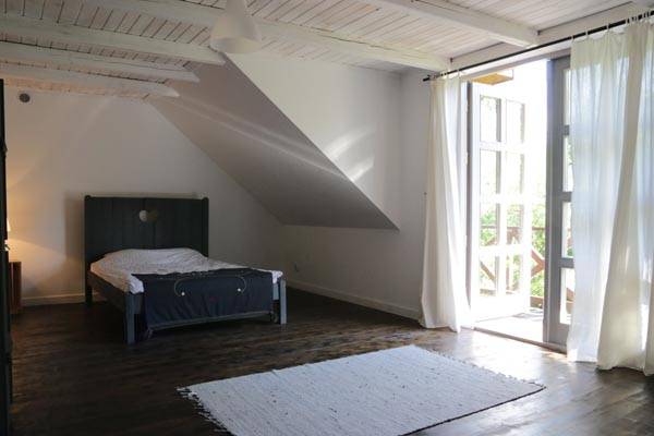Przestrzenny pokój z podwójnym łóżkiem, kanapą i wyjściem na balkon. Łazienka wyposażona w wannę i wspólna kuchnia.